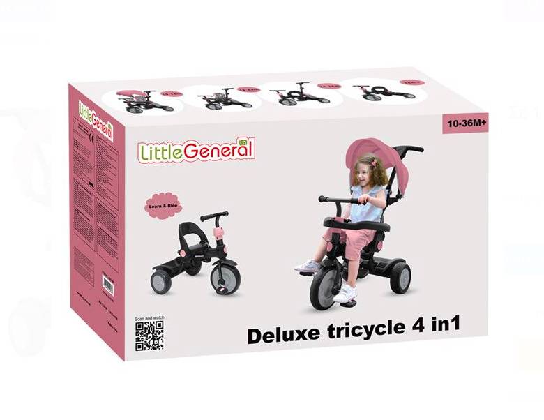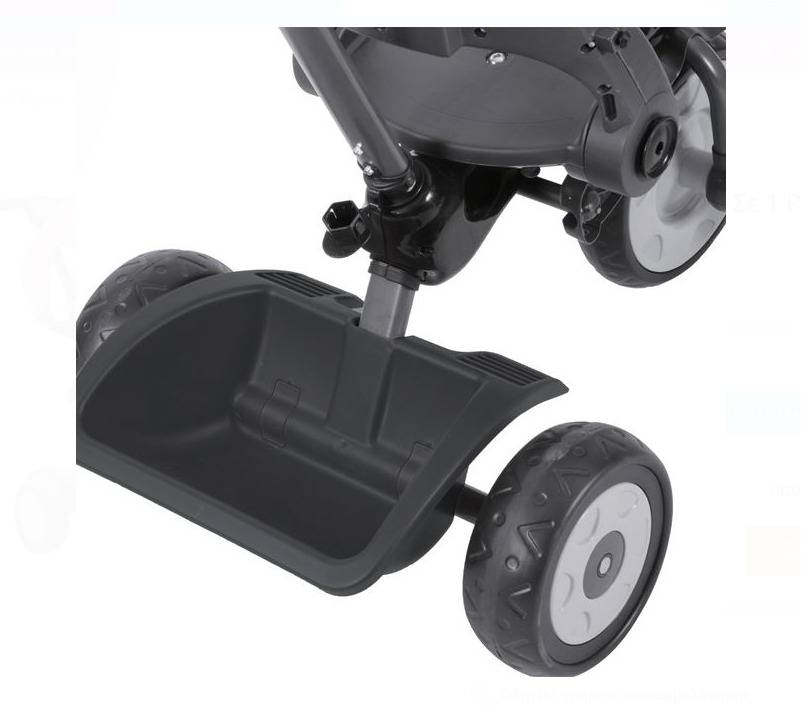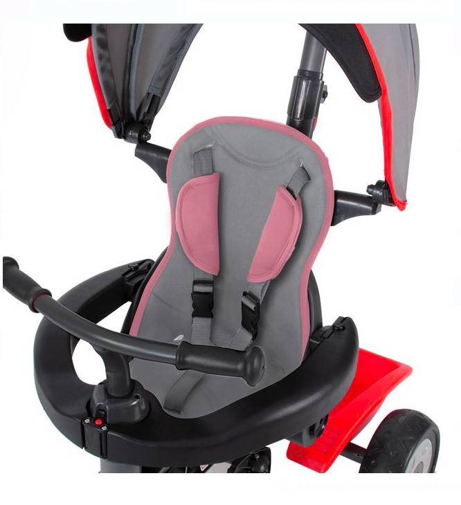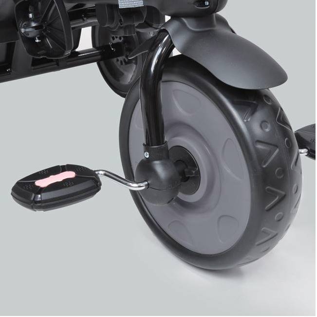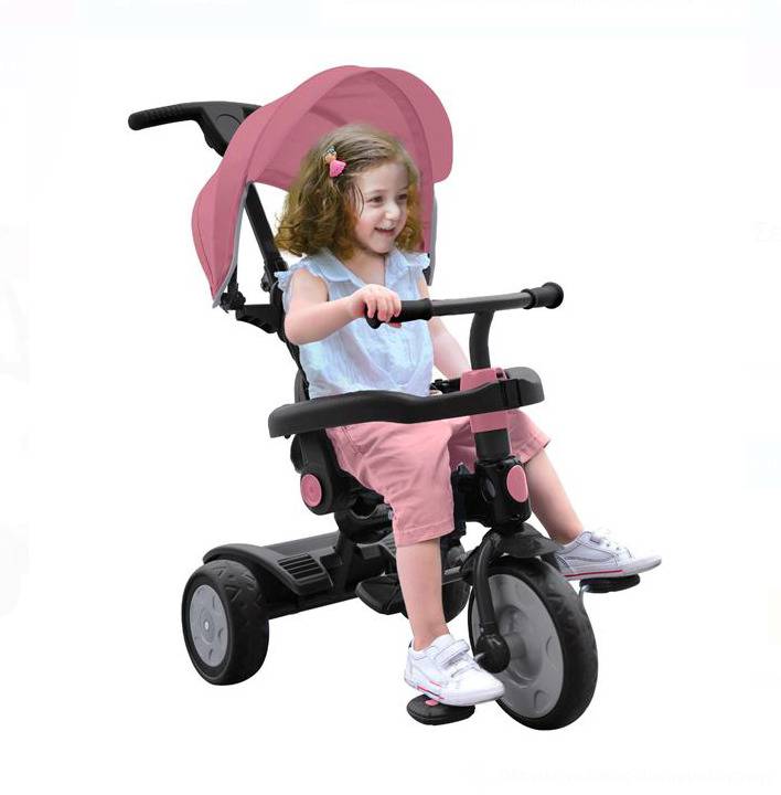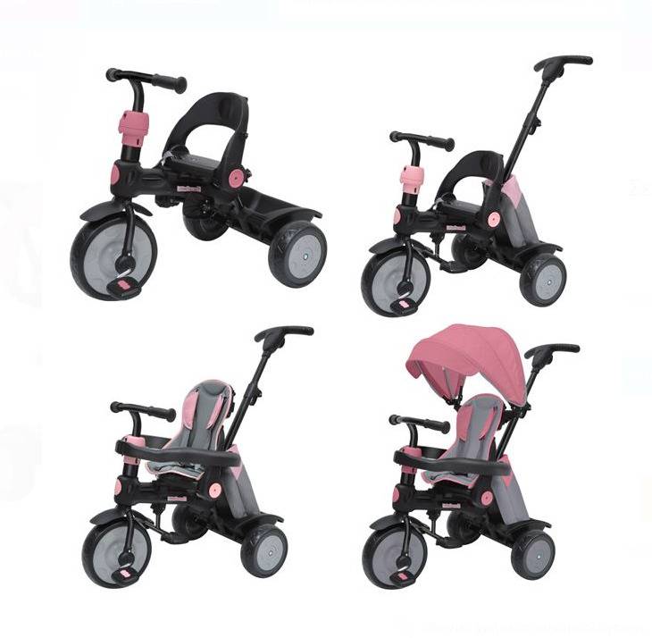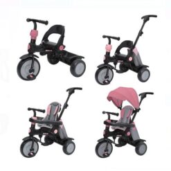 Bicicleta cu cadru metalic, 3 roti si culoare roz-gri. Are mâner reglabil și detașabil pentru asistență din partea părintelui, scaun cu spătar înalt pentru stadiul incipient (10 luni și peste), mânere din cauciuc anti-alunecare, centură de siguranță și bară de siguranță (cotiere), roți din cauciuc de înaltă calitate, mecanism care intră ușor pentru copil pentru a merge pe o bicicletă fără pedale, coș de depozitare spate și parasolar reglabil.