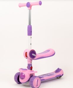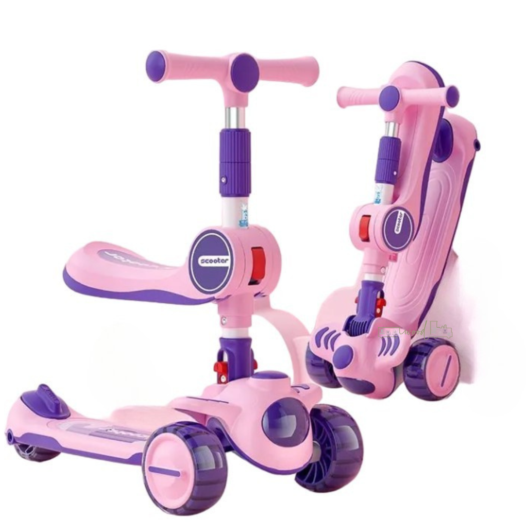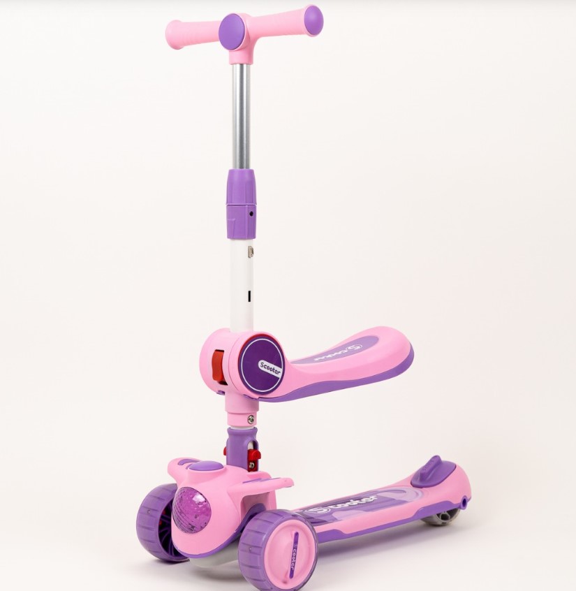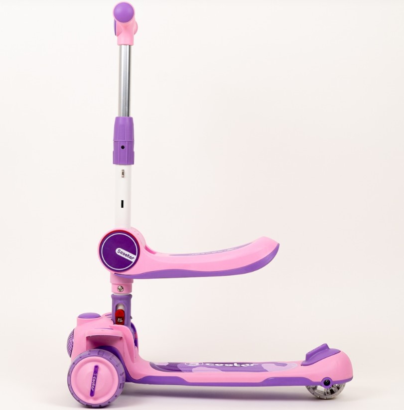 Trotinetă 2 în 1 pentru copii, cu scăunel, pliabilă, 3 roți, lumini și muzică, roz – 2 ani+