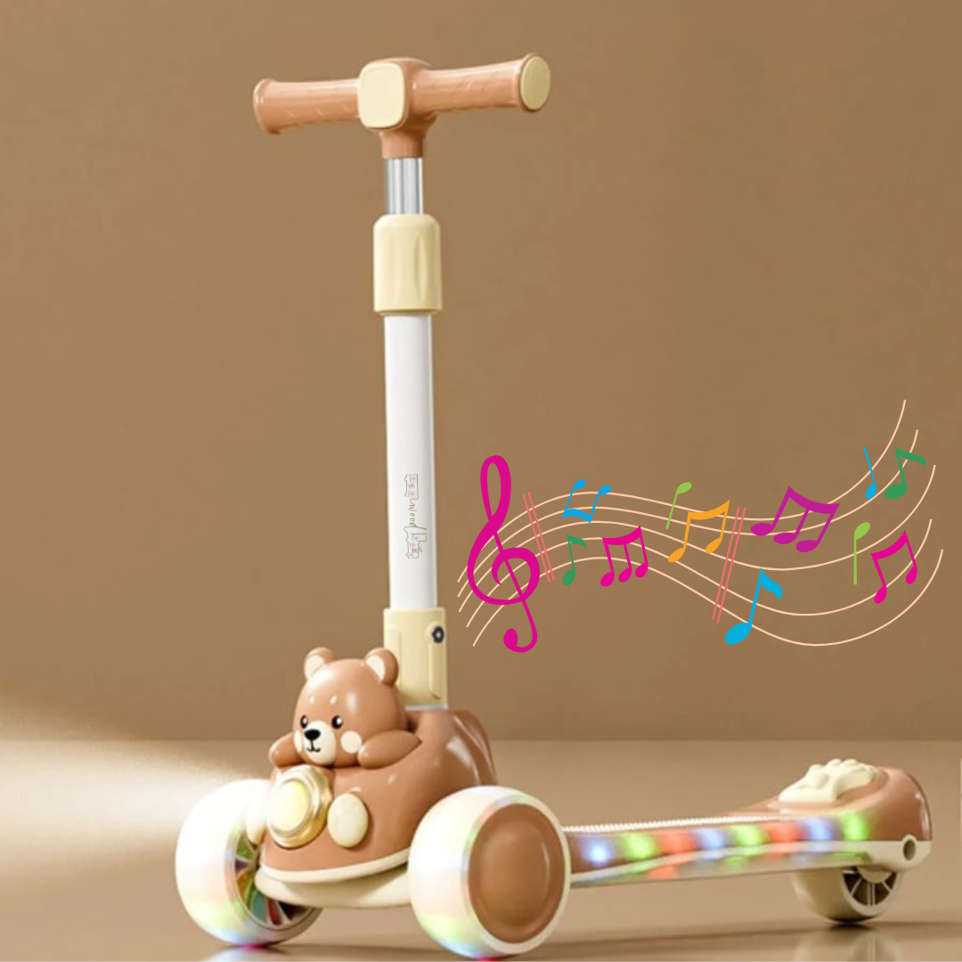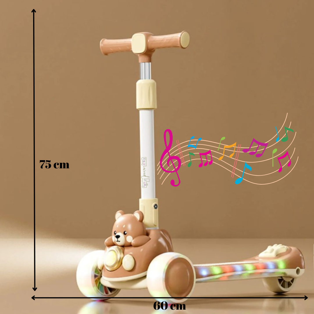 Trotinetă cu 3 roți pentru copii – model Ursuleț Maro, cu far, lumini și sunete, pliabilă, 3 ani+