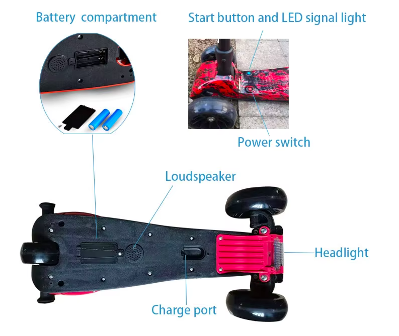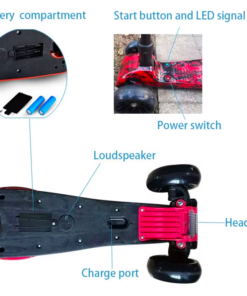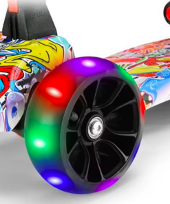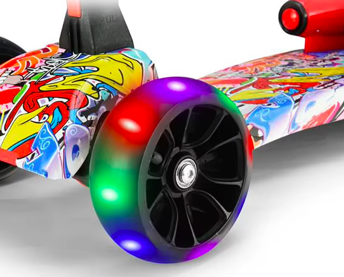 - Roți frontale cu LED-uri – Iluminează automat în timpul mersului, fără a necesita baterii suplimentare.