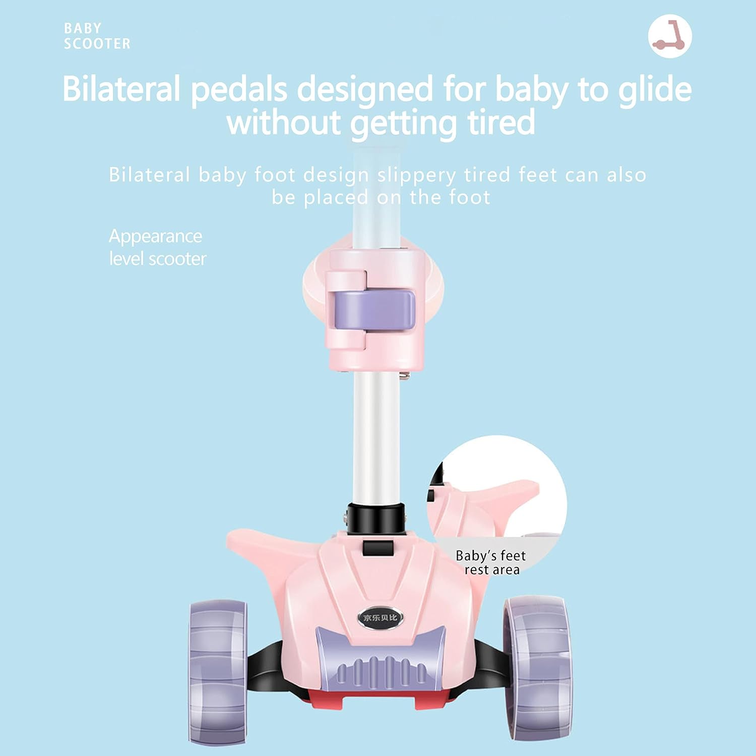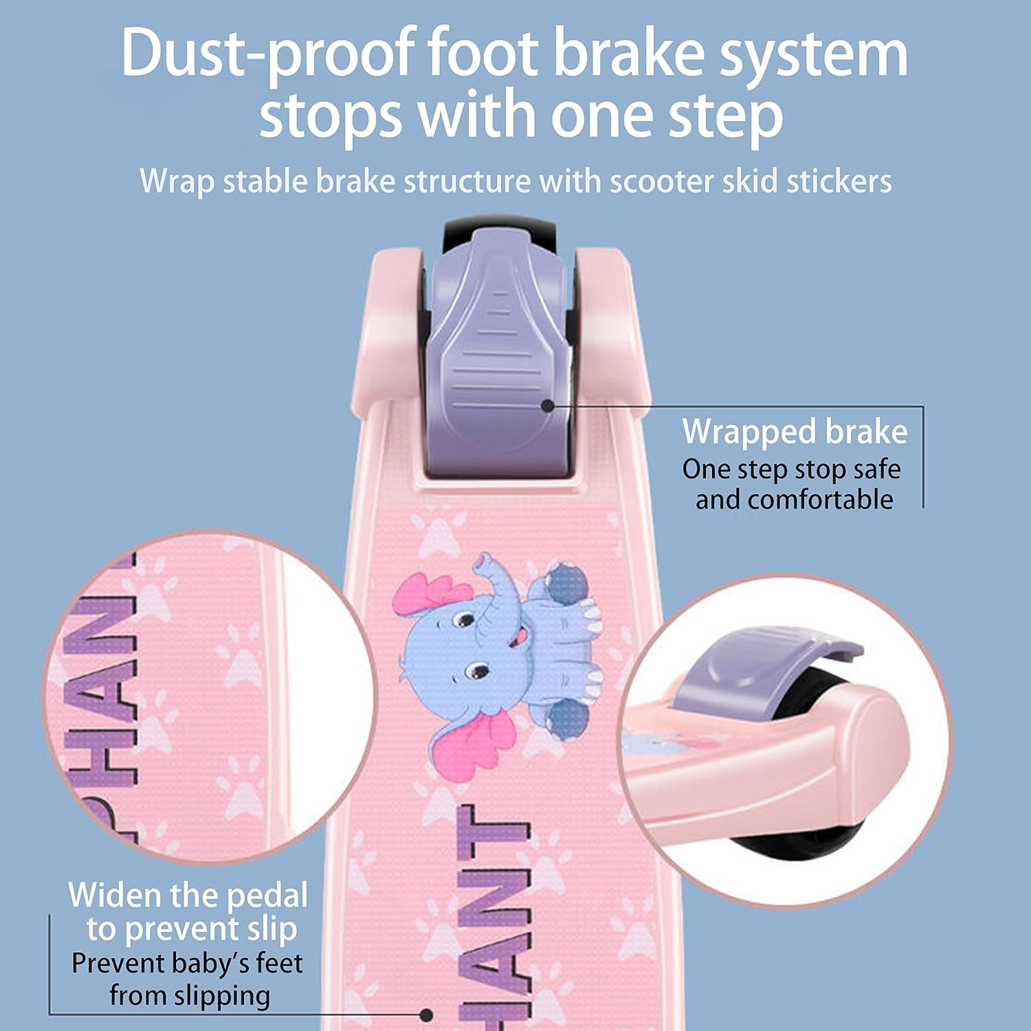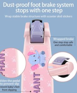 Ghidonul este reglabil pe înălțime, adaptându-se creșterii copilului, iar mecanismul de pliere permite transportul și depozitarea ușoară. Platforma lată și anti-alunecare asigură o poziție stabilă, iar frâna pe spate oferă control și siguranță în timpul deplasării.