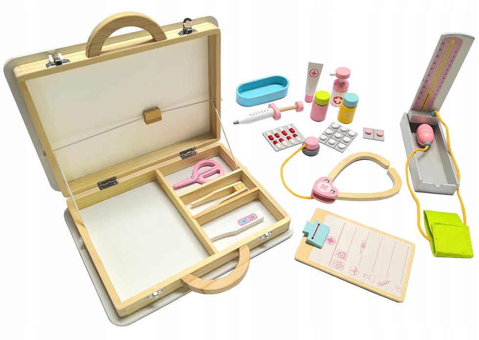 Jucarie educativa, joc de rol, trusa medic din lemn cu accesorii, portabila, intr-o gentuta cu design modern, cu maner.