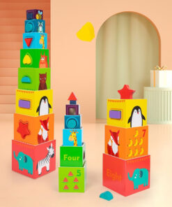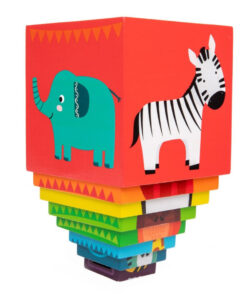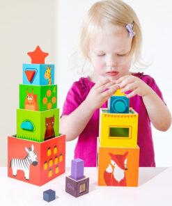 Turnul de stivuire din lemn este un joc educativ care combină învățarea prin joacă cu dezvoltarea abilităților motrice și cognitive. Setul include 8 cutii din lemn de dimensiuni diferite, decorate cu animale simpatice, numere și forme geometrice, concepute pentru a stimula curiozitatea și explorarea activă.
