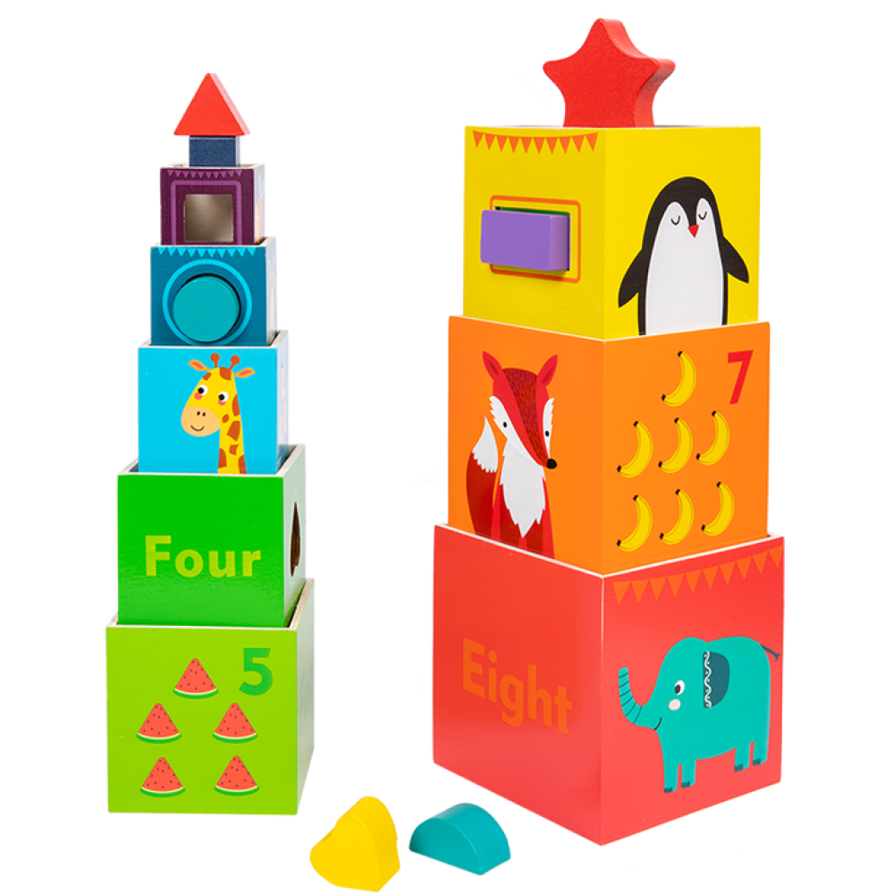 Turn de stivuire din lemn – Cutii colorate cu animale și numere, 3 ani