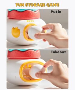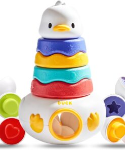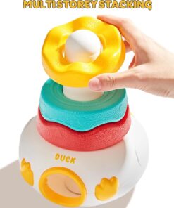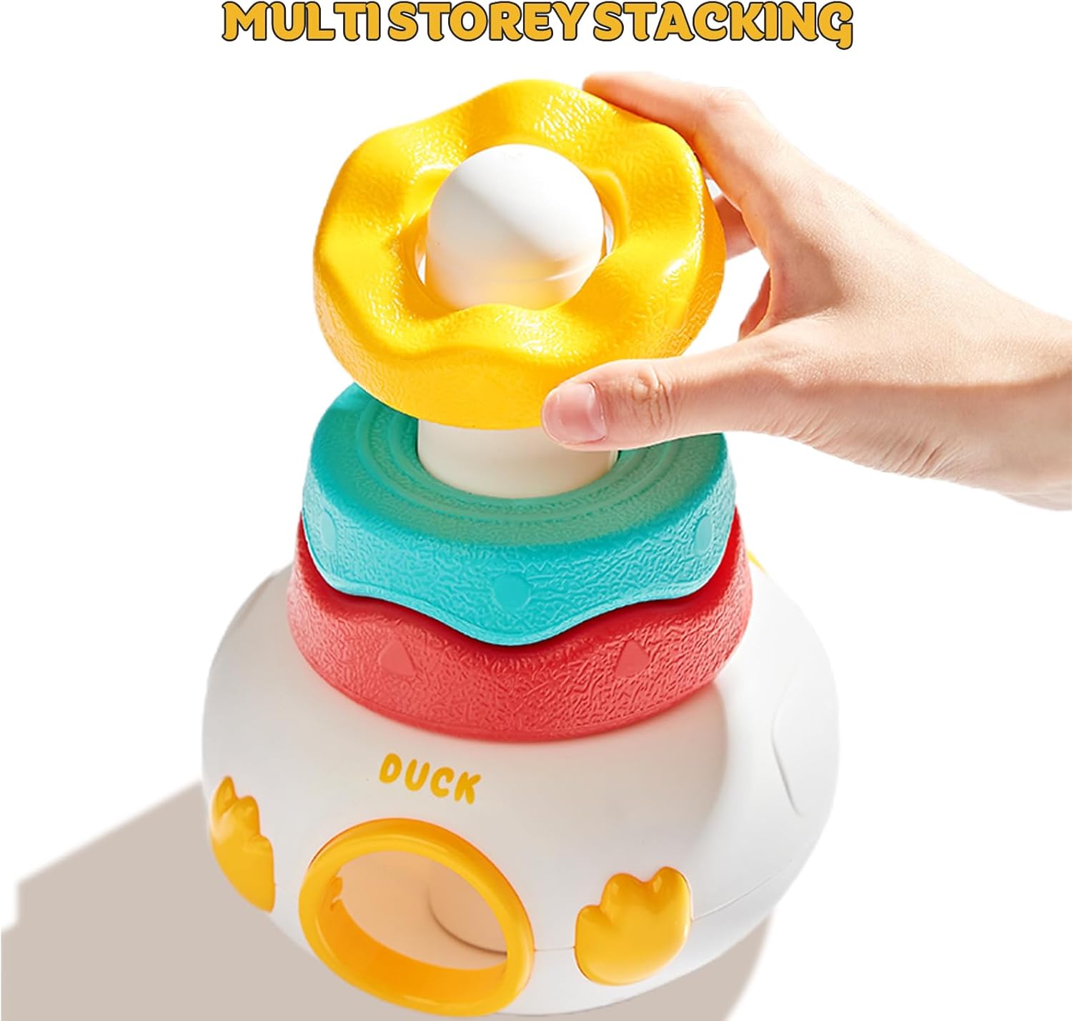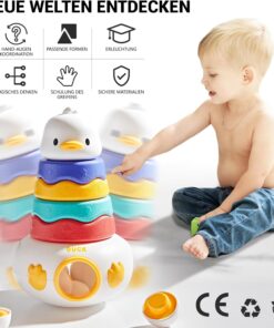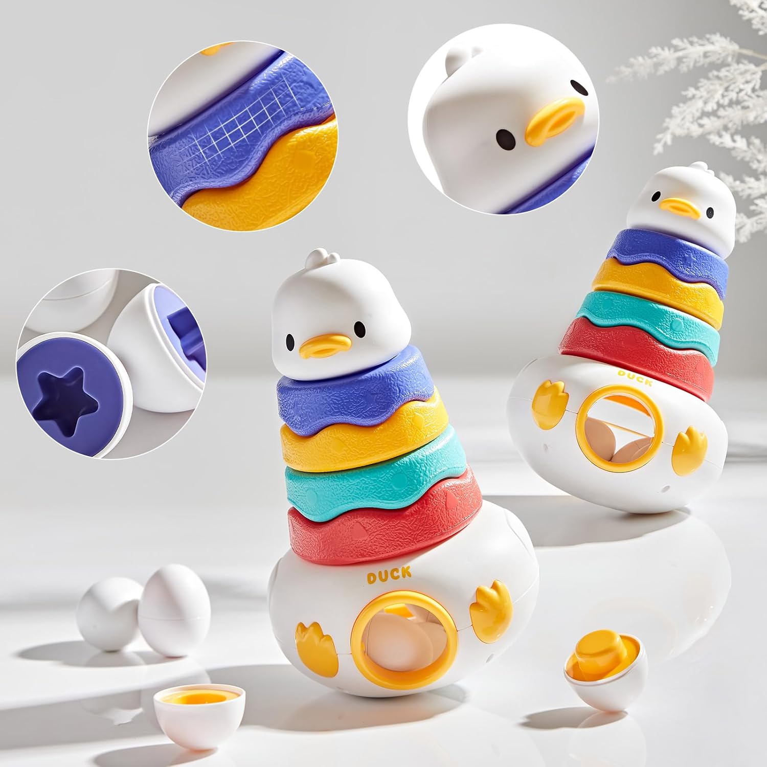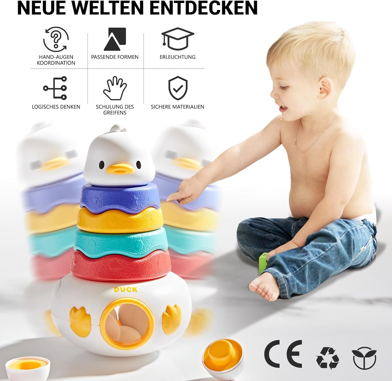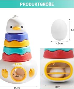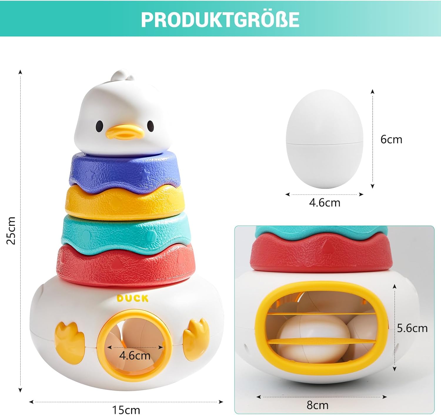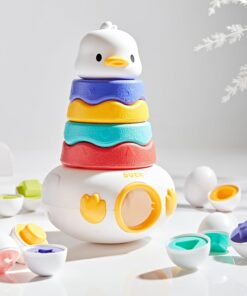 Un joc educativ multifuncțional, conceput pentru a stimula dezvoltarea cognitivă și motrică a copiilor încă de la vârsta de 1 an. Turnul senzorial cu formă de rață îmbină activități variate: stivuirea inelelor colorate, potrivirea ouălor cu forme geometrice și exerciții tactile care ajută la recunoașterea culorilor, texturilor și formelor.