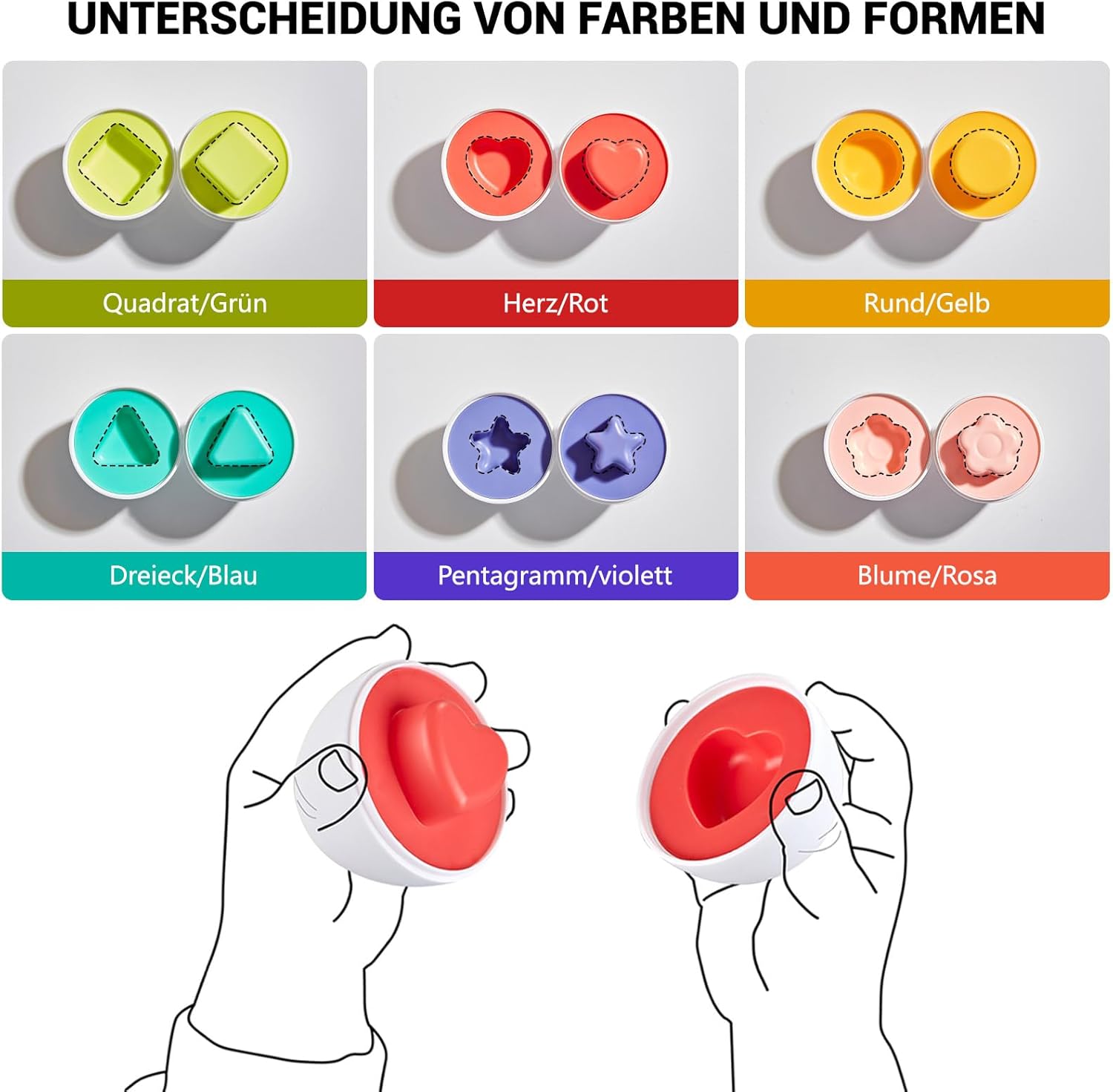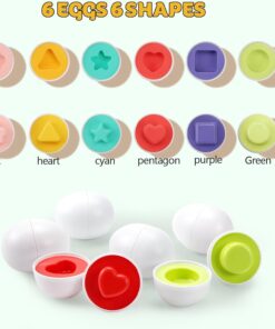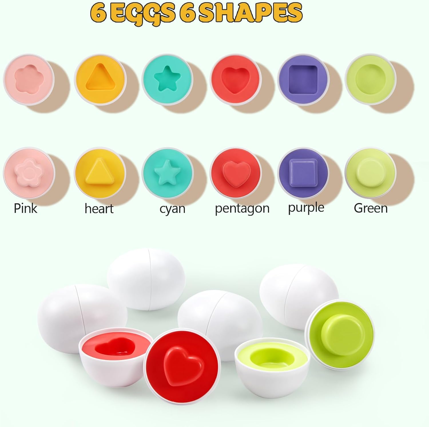 6 ouă detașabile, fiecare cu o formă geometrică distinctă (pătrat, cerc, triunghi, inimă, stea, floare).