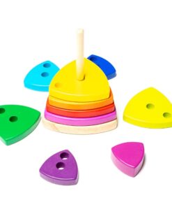 Acest turn piramidă este o jucărie senzorială clasică, reinterpretată într-un design modern și colorat, ideală pentru dezvoltarea timpurie a copiilor. Formele triunghiulare, culorile curcubeului și baza din lemn solid transformă această jucărie într-un instrument perfect pentru învățare prin joacă.