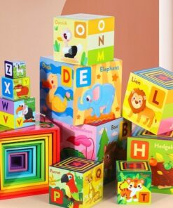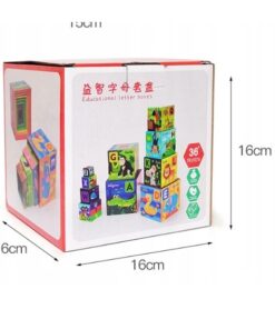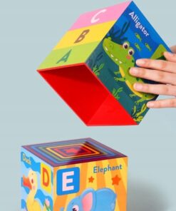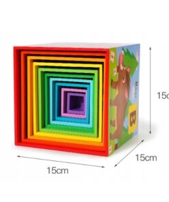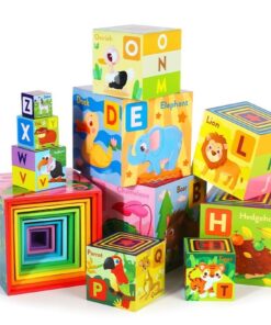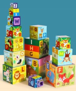 Setul conține 10 cuburi din lemn, de mărimi diferite, concepute pentru a fi stivuite într-o piramidă. Fiecare cub este decorat cu litere (A, B, C etc.), imagini vesele, și culori contrastante, astfel încât jocul să fie atrăgător și educativ.