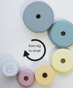 Jucaria educativa tip turn Montessori din lemn este alcatuita dintr-o baza din lemn cu suport vertical, pe care se pun formele din lemn, unul deasupra celuilalt in ordinea marimii, pentru a crea o piramida, sau dupa cum doreste copilul.
