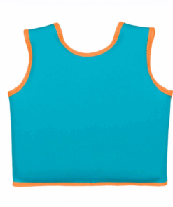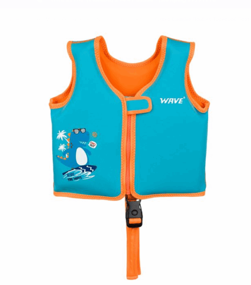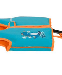 Vesta de salvare de mare, copii, spuma, de culoare turcoaz cu detalii portocalii si imprimeu dinozaur. Are inchidere de siguranta, fermoar.